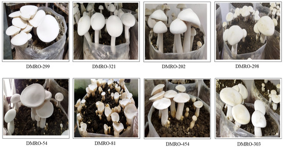 Calocybe indica (P&C), commonly known as milky mushroom, is a tropical edible mushroom, originating in the Indian sub-continent. Unlike the common white button mushroom, C. indica requires warm and humid tropical climate for cultivation. With robust yield, attractive color, culinary delicacy and nutritional properties, milky mushroom has attracted the prospective mushroom growers, especially in the southern part of India [1,2,3]. It is one of the five major commercial mushrooms grown in India and comprises about 3 per cent of total production [4]. Longer shelf-life and white color of the fruit body are the key attractive features of C. indica which increase its demand among mushroom growers and consumers [5,6]. Moreover, the morphological resemblance of C. indica with Agaricus bisporous (common white button mushroom) augmented its popularity in India [3]. C. indica also possesses various medicinal and therapeutic applications. A detailed review on the account of nutritional and medicinal properties of C. indica was presented by Shashikant et al. [7] in which its potential anti-oxidant, anti-cancer, anti-obesity, hepatoprotective and anti-aging activities were reported. Despite its importance, very few strains were reported for commercial cultivation in India viz. APK-2 [8,9], Directorate of Mushroom Research (DMR)-Milky-985, DMR-Milky-334 (DMRO-302) [10,11]. In addition to this, high yielding strains were also reported by different researchers from different geographical regions of India viz. Jharkhand [12], Uttar Pradesh [13], Tamil Nadu [14], and Punjab [15].