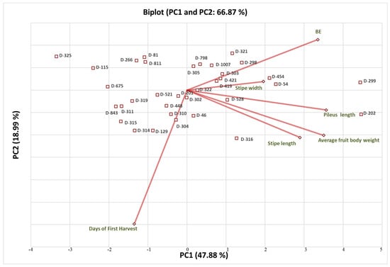 A total six components were found in the PCA analysis. The eigen values of the components were 2.873 (PC1), 1.139 (PC2), 0.931 (PC3), 0.581 (PC4), 0.346 (PC5) and 0.129 (PC6). The per cent variability of each component was 47.88 (PC1), 18.99 (PC2), 15.52 (PC3), 9.67 (PC4), 5.77 (PC5) and 2.15 (PC6). Three principal components, PC1, PC2 and PC3, were found relevant and important, accounting a total of 82.39% of variation. In the scree plot, X and Y axis shows principal components and eigen values, respectively (Figure 3). The PC1 component was directly correlated with BE, stipe width, pileus length, average fruit body weight and stipe length (Figure 4). The PC2 and PC3 correlated with days to harvest (Figure 4 and Figure 5). On the basis of PC1 and PC2 biplot, it can be seen that DMRO-298, DMRO-321, DMRO-303, DMRO-1007, DMRO-798, DMRO-305, DMRO-419, DMRO-421, and DMRO-322 strains formed one group for BE. The stipe width group contains DMRO-299, DMRO-454, DMRO-419, DMRO-421, and DMRO-54 strains. Moreover, the strains grouped under pileus length, average fruit body weight and stipe length were DMRO-202, DMRO-528, DMRO-322 and DMRO-316. The PCA biplot revealed that BE has a low angle between pileus length and average fruit body weight and were mostly correlated. Pileus length, average fruit body weight and stipe length have low angles which indicate positive correlation with each other (Figure 2). A similar analysis was also performed for selection in the different strains of A. bisporous [40].