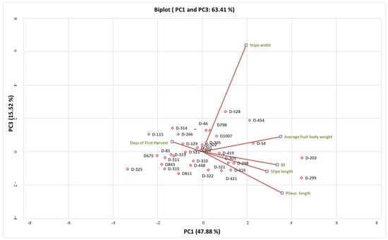 PCA biplot (PC1 and PC3) showing the relation of strains of C. indica with different morphological parameters. D: DMRO, BE: Biological Efficiency.