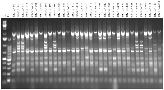 Representative SRAP-based PCR profiling (Me7 + em7 primer combination) in the thirty-three strains of Calocybe indica using primer. DNA ladder: L1 and L2.