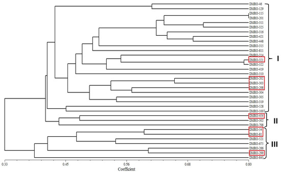 UPGMA-based cluster analysis of the thirty-three strains of C. indica along with control (DMRO-302). Red box reveals the eight high yielding strains.