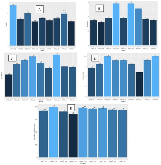 Nutritional profiling of the eight high yielding strains along with the control (DMRO-302). (A) Protein, (B) Crude fat, (C) Crude fiber, (D) Ash content and (E) Carbohydrate content.