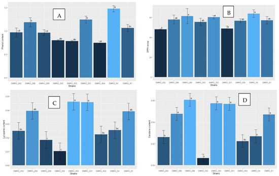 Bioactive compound analysis of the eight high yielding strains along with the control (DMRO-302). (A) Phenol content, (B) Antioxidant activity by DPPH assay, (C) Lycopene content, and (D) β-carotene content.
