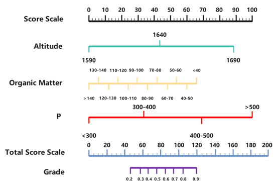 | Altitude (m) | Organic Matter (g/kg) | P (mg/kg) | Tea Polyphenol (mg/kg) | Grade | Correct |