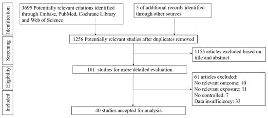 The flow diagram screening and process of selecting the articles is illustrated in Figure 1. A total of 3700 publications were found after searching the Embase, PubMed, Web of Science, and Cochrane databases and after removing duplicates. After the initial title and abstract screening, 101 full-text articles were assessed for further examination. Subsequently, 61 articles were excluded for the reasons detailed in the flow chart (10 studies had no biomarkers for lipids; the dietary or supplement LA did not meet the set requirements in 11 studies; 7 of the studies had no suitable control group; and 33 articles did not provide sufficient data for meta-analysis). In the end, a total of 40 articles were included in the qualitative synthesis (systematic review).