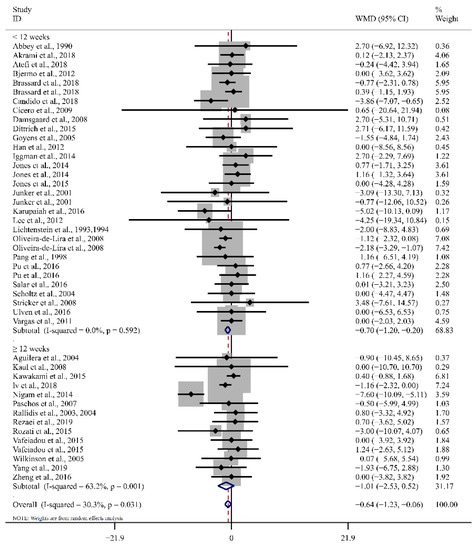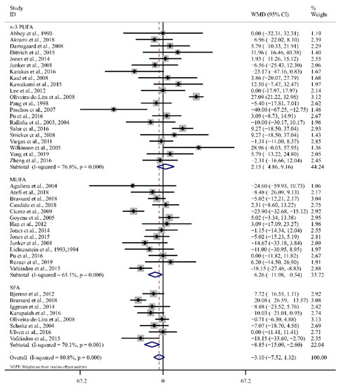Among the eligible studies, there was no significant change in TC concentration after LA intake, showing high levels of heterogeneity (WMD: −3.10 mg/dL, 95% CI: −7.52, 1.32, p = 0.17, I2 = 80.8%). As shown in Table 2 and Figure 2, the subgroup analysis indicated a higher significant reduction in TC using studies employing LA supplementation compared with SFA and MUFA supplementation, but not for n-3 PUFA supplementation. Furthermore, when the studies were grouped by BMI, the significant effects of LA on TC levels were evidenced in BMI < 30 kg/m2 (WMD: −5.88 mg/dL, 95% CI: −10.04, −1.73, p < 0.01, I2 = 61.8%).