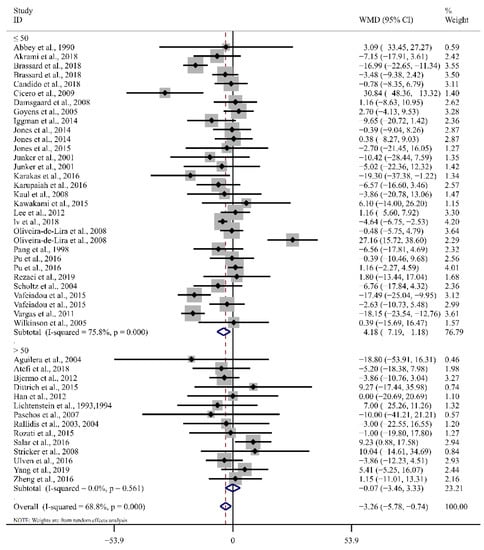 In comparison to the control group, the pooled results demonstrated that LA supplementation led to a noteworthy reduction in blood LDL-C concentration by 3.26 mg/dL (95%CI: −5.78, −0.74, p = 0.01). A moderate level of heterogeneity was observed across studies (I2 = 68.8%, pfor heterogeneity = 0.00). As shown in Table 2 and Figure 4, LA supplementation decreased LDL-C by 4.19 mg/dL in the subgroup of ≤ 50 years of age (95% CI: −7.19, −1.18, p < 0.01, I2 = 75.8%). The subgroup analysis found that LA supplementation resulted in a greater reduction in blood LDL-C than that found in the SFA group (WMD: −7.65 mg/dL, 95% CI: −11.79, −3.52, p < 0.01, I2 = 73.6%). LDL-C levels were significantly reduced by −3.74 in subjects with normal lipids (95% CI: −5.46, −2.02, p < 0.01, I2 = 0.0%), 4.11 in those with a BMI of < 30 kg/m2 (95% CI: −6.60, −1.61, p < 0.01, I2 = 54.5%), and 2.56 in those supplemented with sunflower oil (95% CI: −5.20, −0.09, p = 0.04, I2 = 15.8%). Interestingly, LA supplementation at doses greater than 20 g/d induced a significant decrease in TC and LDL-C levels, while doses of 0–20 g/d had no significant effect.