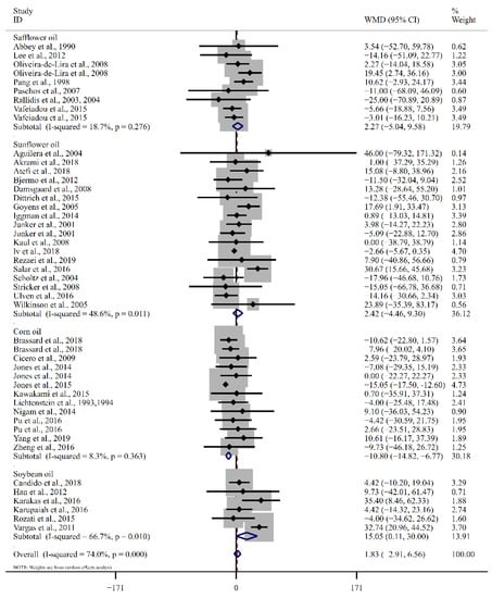 The current study showed that LA increases HDL-C less compared to the other control groups. Some studies reported that a high PUFA intake is associated with lower HDL-C levels compared to high SFA and MUFA intake [18,32,48]. Similar results were revealed by Ghobadi, showing that OA has a greater beneficial effect on HDL-C compared to LA [71]. The subgroup analysis also found that LA intake increased HDL-C less than SFA, which was consistent with the above evidence. This discrepancy may be due to the distinct mechanism of HDL-C when compared to other lipid indicators. Furthermore, soybean oil significantly decreased HDL-C and increased TG compared with other vegetable oils. The subgroup analysis showed that corn oil lowered TG and sunflower oil lowered LDL-C more than other vegetable oils. Different types and contents of sterol, polyphenols, and tocotrienol compounds in vegetable oils can reduce lipid levels in different ways. Plant sterols reduce cholesterol esterification and inhibit the intestinal absorption of cholesterol due to their structural similarity with cholesterol [76]. Polyphenols can lower lipids and inhibit accelerated atherosclerosis by stimulating AMP-activated protein kinase [77]. Tocotrienol inhibits the accelerated oxidation of cholesterol via amidine dihydrochloride 2-methylpropionate [78].