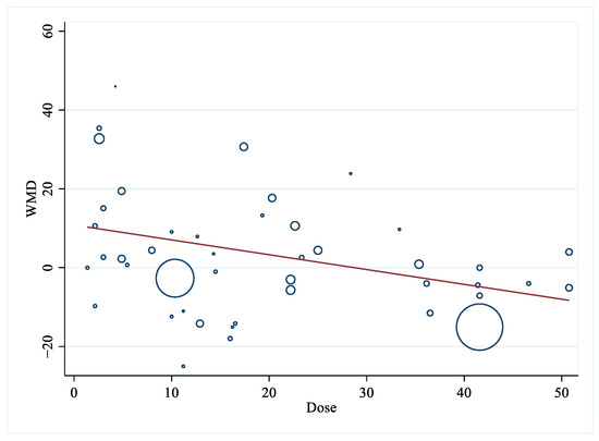 The pooled results obtained using the random effects model indicated that LA consumption had a non-significant effect on the serum TG level compared to other fatty acids (WMD: 1.83 mg/dL, 95% CI: −2.91, 6.56, p = 0.45). There was significant heterogeneity across the trials (I2 = 74.0%, pfor heterogeneity = 0.00). In Table 2 and Figure 5, a subgroup analysis was conducted based on different types of control groups, revealing that the LA supplementation group exhibited a significant reduction in TG levels compared to the SFA consumption group (WMD: −3.33 mg/dL, 95% CI: −5.99, −0.68, p = 0.01, I2 = 0.0%). Furthermore, the reduction in blood TG was significantly lower for the LA consumption group compared to the n-3 PUFA consumption group (WMD: 9.42 mg/dL, 95% CI: 1.40, 17.44, p = 0.02, I2 = 44.7%). After categorizing the studies based on the type of intervention, TG was significantly decreased for LA supplementation using corn oil. Meanwhile, LA consumption using soybean oil had reduced serum TG significantly less. In terms of dose difference, the overall trend was that the effect of LA intake decreased with dose, and that significant differences were found regarding the ratio of TG in the studies stratified by dose (p for meta regression =0.027) using meta-regression analysis (Figure 6).
