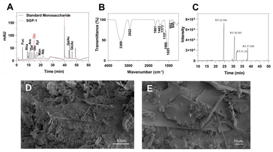 Structural characterization of SGP-1. (A) Liquid chromatograms of standard monosaccharides and SGP-1; (B) FTIR spectrum of SGP-1; (C) GC-MS chromatogram of polysaccharide methylated sugar alcohol acetyl ester (PMAA); (D) SEM images of SGP-1 (5000-fold); (E) SEM images of SGP-1 (5000-fold).