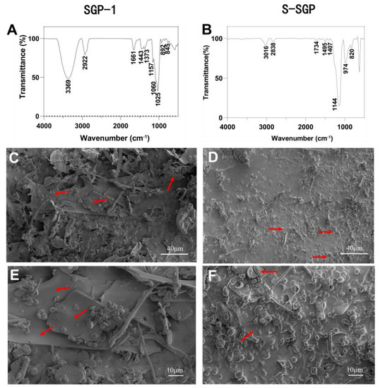 (A) FT-IR spectrum of SGP-1; (B) FT-IR spectrum of S-SGP; (C) SEM images of SGP-1 (2000×); (D) SEM images of S-SGP (2000×); (E) SEM images of SGP-1 (5000×); (F) SEM images of S-SGP (5000×). Following sulfation modification, there is a clear reduction of the presence of lamellar structures within the polysaccharide matrix, accompanied by a prominent increase in the formation of aggregated granular structures.