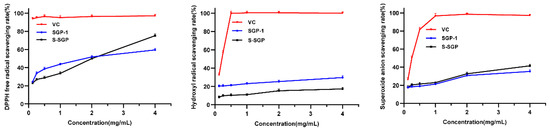 Figure 3 demonstrates the scavenging ability of SGP-1 and S-SGP towards DPPH·. At a concentration of 1 mg/mL, the polysaccharide exhibited an enhanced ability to scavenge DPPH. At this time, the DPPH· scavenging rates of SGP-1 and S-SGP were 43.79% and 33.74%, respectively. With the increase in polysaccharide concentration, the activity of the polysaccharide also gradually increased. Specifically, at a concentration of 4 mg/mL, the DPPH· scavenging rate of S-SGP (75.24%) was obviously higher than that of SGP-1 (59.53%). When the concentration of polysaccharide was 2 mg/mL, the clearance rate of ·OH showed a certain upward trend. At this time, the ·OH clearance rates of SGP-1 and S-SGP were 25.32% and 15.27%, respectively; when the polysaccharide concentration reached 4 mg/mL, the ·OH clearance rates of SGP-1 and S-SGP increased to 29.68% and 17.25%, respectively. When the polysaccharide concentration was 2 mg/mL, the clearance rate of O2−· increased slightly. At this time, the O2−· clearance rates of SGP-1 and S-SGP· were 30.79% and 32.67%, respectively. When the polysaccharide concentration was 4 mg/mL, the O2−· clearance rate of S-SGP (41.52%) was higher than that of SGP-1 (35.34%). Briefly, the scavenging abilities of SGP-1 and S-SGP against DPPH radicals, ·OH and O2−· were enhanced with increasing polysaccharide concentration. With the introduction of sulfate groups, the DPPH scavenging activity and O2−· scavenging activity of S-SGP were enhanced. Similar observations have been reported in some sulfated mushroom polysaccharides [54]. However, the hydroxyl radical scavenging activity did not show an increase, which may be attributed to the structural changes of the polysaccharide caused by the acidic conditions during sulfation. These structural changes could potentially impact its activity.