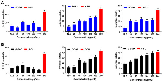 The CCK-8 method was used to measure the in vitro growth inhibitory effects of polysaccharides before and after sulfate modification on three cancer cells. Different concentrations of SGP-1 and S-SGP (12.5, 25, 50, 100, 200 and 400 μg/mL) were co-cultured with HepG2 cells, A549 cells and MDA-MB-231 cells for 48 h, respectively. The CCK-8 method detected the effect of polysaccharides in cell proliferation, as shown in Figure 4, with the concentration of polysaccharide and positive control 5-FU as the abscissa, and the inhibition rate (%) on cell proliferation as the ordinate.