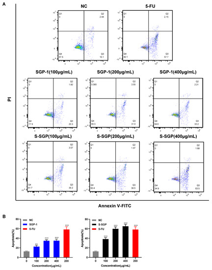 Cells (2 × 105 cells/mL) were incubated in 6-well plates with different concentrations of S-SGP solutions (0, 100, 200, 400 μg/mL), and 5-FU (200 μg/mL) was used as a positive control. After 48 h of incubation, cells and culture medium were collected, centrifuged (1000 rpm, 5 min) and the supernatant was discarded; 195 μL of Fluorescein Isothiocyanate-labeled Annexin V (Annexin V-FIT, a commonly used fluorescent probe for detecting cellular apoptosis) conjugate was added to gently resuspend the cells, then Annexin V-FITC (5 μL) was added, gently mixed and then propidium iodide (PI) staining solution (10 μL) was added to mix again. Incubate with aluminum foil for 15 min at 25 °C in the dark, resuspend the cells 3 times during this period, place in an ice bath, and analyze by flow cytometry (BD) immediately.
