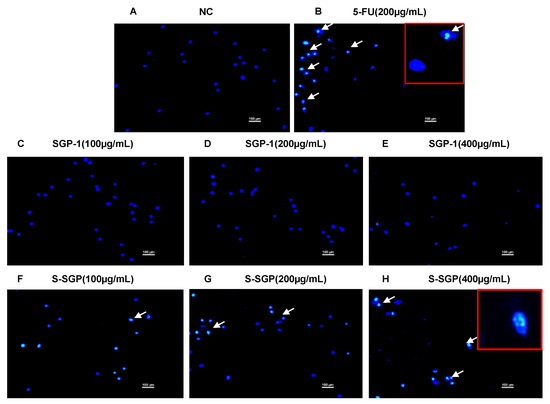 The nuclear morphology of A549 cells in each group was observed by DAPI staining. (A) NC group. (B) 5-FU group (200 μg/mL). (C–E) SGP-1 group (100 μg/mL, 200 μg/mL, and 400 μg/mL). (F–H) S-SGP group (100 μg/mL, 200 μg/mL, and 400 μg/mL) (DAPI-stained nuclei show blue fluorescence; typical apoptotic cells are indicated by white arrows).