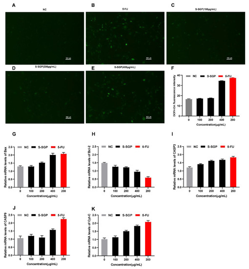 Reactive oxygen content and apoptosis-related gene expression in A549 cancer cell lines after S-SGP treatment. (A–E) The content of ROS in A549 cells from each group was assessed using DCFH-DA staining; (F) the effect of S-SGP on the content of reactive oxygen species in A549 cells; (G–K) relative mRNA expression levels of apoptosis-related genes in A549 cancer cell line treated by S-SGP.