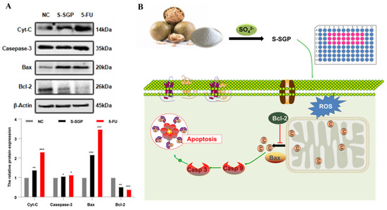 Using 200 μg/mL 5-FU as a positive control, cells were harvested after 48 h of incubation with different concentrations of S-SGP (0, 100, 200, 400 μg/mL). Total RNA was extracted using RNeasy Mini-Kit according to the manufacturer’s instructions, and the concentration and purity of the extracted RNA were measured with an ultra-micro UV spectrophotometer. A ratio of OD260/OD280 between 1.8 and 2.0 indicated the acceptable purity of the RNA. Total RNA was reverse transcribed with reverse transcriptase according to the manufacturer’s protocol (MightyScript First Strand cDNA Synthesis Master Mix Kit, Sangon, China). The full sequences of Cyt-C, Caspase 9, Bcl-2, Bax and Caspase 3 genes were all obtained from Genebank. Premier 5.0 software was used to design the primers of the six genes synthesized by Sangon Bioengineering Company. The primer sequences are shown in the Table S1. The qRT-PCR was performed using a 2× SYBR Green qPCR Master Mix (Low ROX) reaction system and the reaction program settings pre-denaturation were as follows: 95 °C, 30 s, 40 cycles of denaturation; 95 °C, 15 s, annealing/extension: 60 °C, 30 s.