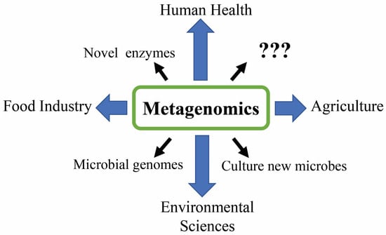 Previous reviews have summarized various aspects of metagenomics, including reviews of the methods and pipelines in metagenomics [19,20,21], as well as reviews of different applications of metagenomics in various fields [22,23,24]. In the present review, we summarized the principles of metagenomics using the latest approaches. We also reviewed recent metagenomic studies on human health, agriculture, food industry, environmental sciences, etc., along with their applications. Although previous metagenomic studies have reported significant results, there are still potential applications of metagenomics awaiting discovery. Therefore, we also discuss future perspectives on metagenomics (Figure 1).
