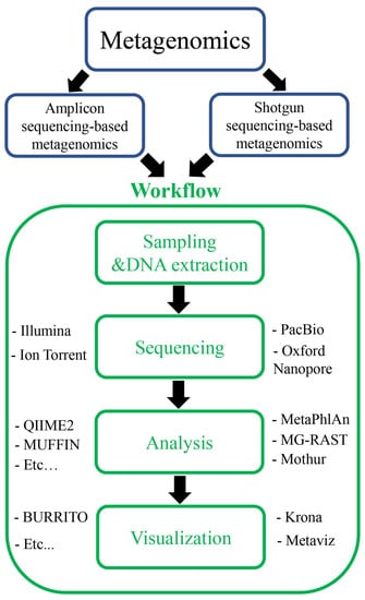 Although the data are different, the process of metagenomics consists of four main steps: sampling and DNA extraction, sequencing, analysis, and visualization (Figure 2). Wajid et al. compared these steps to the process of composing music, in an analogy intended to make the concept of metagenomic research more understandable to an unfamiliar readership [28]. Metagenomic studies often contain a continuous sequence of steps, in which the previous steps decide the outcomes of downstream steps. The samples for metagenomics research are collected directly from the field, so care must be taken care to prevent contamination from other sources. DNA extraction should also be conducted carefully to limit any impurities from the host DNA. In previous studies, specific protocols were developed for different samples such as human fecal samples, tropical soils, and plant tissues [29,30,31]. Meanwhile, commercial kits for metagenomics have also been developed such as FastDNA™Spin Kit for Soil (MP Biomedicals, Irvine, CA, USA), FavorPrep™ Soil DNA Isolation Mini Kit (Favorgen Biotech, Taiwan, China), MagAttract PowerSoil DNA KF Kit (Qiagen, Redwood, CA, USA), PureLink MicrobiomeTM Purification Kit (ThermoFisher Scientific, Waltham, MA, USA), and ZymoBIOMICS 96 Magbead DNA Kit (ZymoBIOMICS, Irvine, CA, USA). The availability of different kits and protocols triggered comparison studies examining the effectiveness of those methods for DNA extraction [32,33,34,35]. The outcomes of those studies suggested that the DNA extraction efficiency and selection of extraction protocols depended on the sample types used. Therefore, suitable protocols or kits should be considered and applied to obtain good results from metagenomic studies.