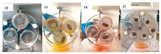 The appearance of the non-compliant tablets after the disintegration test. The test was performed using water at 37 °C as the immersion liquid. For samples #2, #3, and #4 (film-coated tables), the disintegration time was set at 30 min, while for sample #7 (uncoated tablet) the time was set at 15 min. Apparatus B was used for samples #2, #3, and #4 (diameter > 18 mm) and apparatus A was used for sample #7 (diameter < 18 mm). Disks have been used for all the samples.