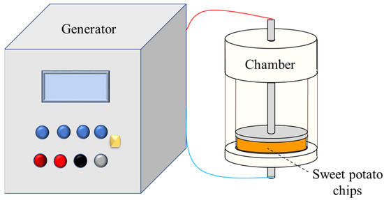 A PEF generator delivering monopolar pulses (1500 V-1A, Service Electronique USST, Shanghai, China) was used. Figure 1 presents the PEF-applied treatment procedures for sweet potato slices. The processing chamber (Teflon cylindrical tube, industrial processes workshop, USST, Shanghai, China) consisted of two parallel stainless steel electrodes and had a diameter of 41.5 mm and a depth of 100 mm. The electric field intensity was E = 1k V/cm and there were a series of N = 200 trains. Each train consisted of n (=50) pulses with a pulse width of ti = 20 μs and a frequency of 10 Hz. The total time of the PEF treatment was calculated as tPEF = N·n·ti = 0.2 s. The applied protocol allowed for obtaining a high level of electroporation of sweet potato tissue based on our preliminary studies. The temperature elevation inside the samples never exceeded 5 °C. The energy input of the PEF pretreatment was 9.47 ± 0.5 kJ/kg, calculated as follows [21]: