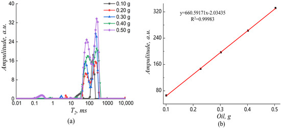 The sunflower oil was weighed in 15 mm glass tubes with weights of 0.1, 0.2, 0.3, 0.4, and 0.5 g, which were measured in a water bath at 32 °C for 5 min to obtain the amplitude corresponding to the different masses of oil. Figure 2a presents the distribution of the transverse relaxation time (T2) spectra for different masses of sunflower oil. The relaxation signal shown in the figure can be entirely attributed to the protons in the oil molecule and is composed of a small and large characteristic peak. The oil peak emerged in the range of 12–464 ms, providing a basis for distinguishing the proton signals of water and oil in the sample. The signal amplitude increased as the oil mass increased. The linear equation fitted to the mass and amplitude of the oil was y = 660.59172x − 2.03436, with R2 = 0.99983, indicating that the mass of the oil linearly and sufficiently correlated with the peak area (Figure 2b). The intensity of the peak signal is linearly related to the mass of oil. Therefore, the correlation between the peak intensity and mass of oil can be determined by calibrating the sample to obtain the oil content (Of) of the sample.