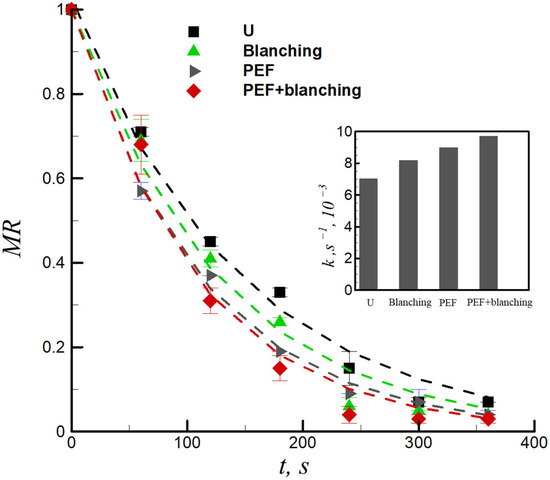 Moisture ratio (MR) versus the frying time for untreated (U), blanching-pretreated, PEF-pretreated, and combination of PEF + blanching-pretreated samples. Inset demonstrates the frying rate constant (k) for the untreated and pretreated samples.