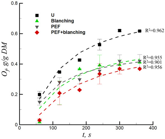 Deep-frying is a mass- and heat-transfer process that involves water evaporation and oil absorption [28]. Figure 4 demonstrates the development of the oil content (Of) for fried sweet potatoes that are untreated, blanched, PEF, and PEF + blanched pretreated samples; the dashed lines were obtained by fitting the data with Equation (5). The relevant correlation coefficients (R2) were all above 0.902, and the parameters of the equation fit for the untreated, blanched, PEF, and PEF + blanched pretreated samples are presented in Table 1. In all cases, the oil content increased as the frying time increased. Compared to the untreated chips, the oil content of the sweet potato chips significantly decreased by 33.38%, 31.90%, and 40.33% with blanching, PEF, and the combination of PEF + blanching pretreatments, respectively. This can be explained by the higher frying rate with PEF pretreatment (Figure 3), which forms a crust on the surface of the sweet potato chips, thereby reducing the oil absorption during frying [15,17,29]. PEF may also cause more cytoplasm to flow out of the cell, forming a water vapor barrier layer on the surface and ultimately reducing oil absorption [30]. In addition, the smoother tissue surface of the samples resulting from the PEF treatment may lead to less oil adhesion after frying due to oil content reduction [31,32]. Similarly, starch gelatinization occurred during the blanching pretreatment, which prevents more oil penetration during the frying process compared to the untreated samples [8,16]. Zhang et al. [26] found that the combination of PEF + blanching pretreatment decreased the oil content of the French fries by 13.8%. Liu et al. [2] investigated the physical–chemical properties of fried sweet potato tubers with PEF pretreatment and found that the oil content decreased by 18.3% with a PEF pretreatment at 1.2 kV/cm and frying temperature of 190 °C.