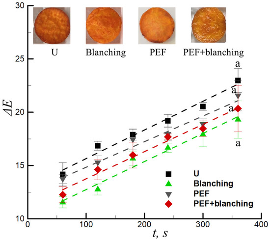 Total color change versus the frying time for untreated (U), blanching-pretreated, PEF-pretreated, and combination of PEF + blanching-pretreated samples. (inset indicates untreated and pretreated samples). a Values with same superscript letters means no significantly difference.
