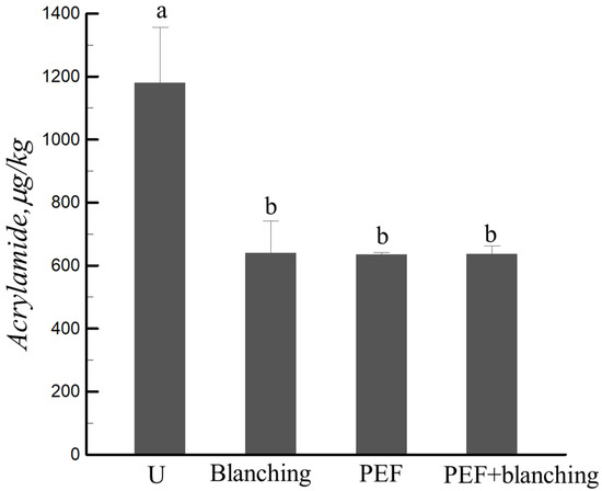 In 2002, the Swedish National Food Administration found that carcinogen acrylamide (AA) was formed in heated starch-based foods [39]. Pedreschi et al. reported that toxic AA is a byproduct of the Maillard reaction of reducing sugars and amino acids during thermal processing [40]. The AA content in the fried sweet potato chips versus the pretreated chips is shown in Figure 7, which demonstrates that pretreatment (PEF, blanching, and PEF + blanching) significantly decreased the AA content in the fried samples by nearly 46.10% compared to the untreated samples. This can be explained by the increase in the frying rate with the pretreatment (less frying time, Figure 3); the leaching of reducing sugars and amino acids from the sweet potato slices by PEF and blanching can also decrease the acrylamide content during frying [41]. The Maillard reaction during frying is related to the degree of browning of the sample. The PEF + blanching pretreatment significantly decreased the color change of the sample (Figure 5) compared to the PEF-pretreated sample; however, there was no significant difference between the pretreatments for AA formation in frying sweet potato chips (Figure 7). Therefore, the formation of AA during frying is not only linked to color change but also to the reaction substrate, frying temperature, and frying time [42,43]. Liyanage et al. [44] demonstrated that an increase in temperature from 160 to 190 °C decreased the AA content by approximately 90%. They also found that the acrylamide formation in cultivars of Atlantic, Snowden, and Vigor pretreated by blanching in distilled water decreased by 19–59%. Genovese et al. reported that the AA reduction for potato chips pretreated by PEF (1.5 kV cm−1, 10 ms, 100 Hz) was 30%, whereas it was 17% for the hot water blanching pretreatment (85 °C, 3.5 min) [45].
