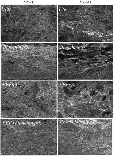 SEM images of fresh (MR = 1) (a) untreated(U), (b) blanching-pretreated, (c) PEF-pretreated, and (d) PEF + blanching-pretreated samples; and fried (MR = 0.1) (e) untreated(U), (f) blanching-pretreated, (g) PEF-pretreated, and (h) PEF + blanching-pretreated samples.