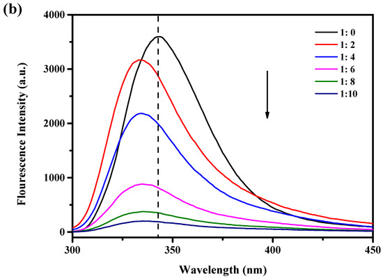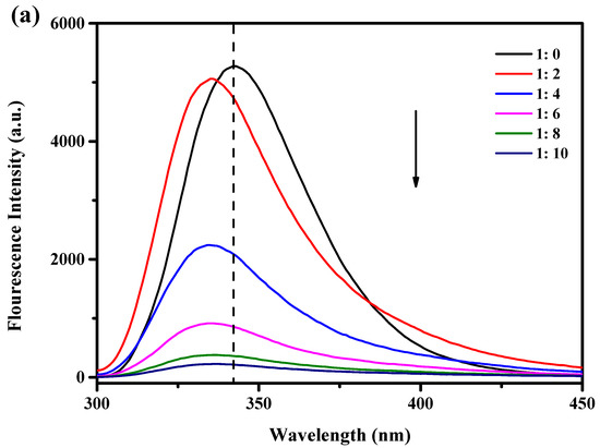 When stimulated at 280 nm, tryptophan (Trp), tyrosine, and phenylalanine show luminous absorption peaks [20]. WPI contains an abundance of Trp residues, and Trp is sensitive to changes in the environment and protein structure and is frequently used as a fluorescent probe to study the interaction between proteins and polyphenols. In this study, the endogenous fluorescence intensity of WPI and WPI-Lac was used to evaluate the change in protein structures after the noncovalent binding of proteins to PCs. Figure 1a,b show that at the excitation wavelength of 280 nm, the protein sample without PCs has a very significant fluorescence emission peak at 342 nm. The endogenous fluorescence intensity of WPI-Lac is lower than that of WPI for two reasons. Glycosylation alters the environment of the Trp group, resulting in a decrease in fluorescence intensity. This is comparable to the effects found in the research of Chen et al. [21] on the relationship between glycosylated proteins and tannins. Second, the other amino acids in WPI combined with lactose to form a copolymer molecular layer that reduced the fluorescence intensity of the proteins. Yu et al. [22] studied the binding of peanut protein and lactose and reached similar conclusions.