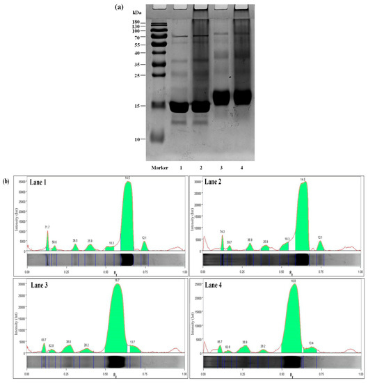 Protein/PC compound SDS-PAGE gel electrophoresis (a) and electrophoresis strip image analysis (b). Note: Lane Marker, protein marker standard (10–180 kDa); Lane 1, WPI; Lane 2, WPI/PCs; Lane 3, WPI-Lac; Lane 4, WPI-Lac/PCs.