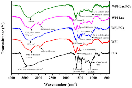 The FTIR spectra of WPI, WPI-Lac, WPI/PCs, WPI-Lac/PCs, and PCs are shown in Figure 4. By comparing the IR spectra of WPI and WPI-Lac, it was shown that the latter displays a notable absorption peak in the range of 1200~1000 cm−1, which is caused by the stretching vibration of the -OH and C-O groups, therefore proving their covalence. The infrared absorption peaks of WPI are 3299 cm−1 (amide A region, indicating -NH elongation and hydrogen bonding), 1640 cm−1 (indicating C=O stretching/hydrogen bonding and COO-), 1640 cm−1 (amide I band, indicating C-N stretching), 2961 cm−1 (amide B, indicating C-N-N stretching), 1547 cm−1 (amide II band, representing C-N stretching and N-H bending), and 1230 cm−1 (amide III strip, indicating C is C-N stretching and N-H bending) [34]. In addition, the broadening of the absorption peak of WPI-Lac at the amide A band of 3700–3200 cm−1 (representing N–H stretching and hydrogen bonding) proved that the number of hydroxyl groups increased after WPI covalently bound to lactose. The Maillard reaction is associated with the formation of amide bonds (C-O, N-H, and C-N), and changes in the two absorption peaks described above demonstrate the occurrence of a glycosylation reaction.