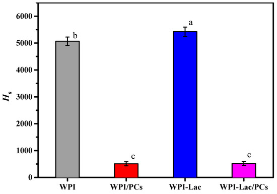Surface hydrophobicity (H0) of protein/PC compounds. Different letters indicate a statistically significant difference (p < 0.05).