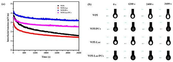 The suspension method was used to determine the dynamic interfacial tension of WPI, WPI/PCs, WPI-Lac, and WPI-Lac/PCs [36]. The oil–water interfacial tension between WPI, WPI/PCs, WPI-Lac, and WPI-Lac/PCs is depicted in Figure 6a for various time intervals. As can be seen from Figure 6, the adsorption process can be divided into two stages [37]: The first stage refers to the rapid absorption of substances such as WPI at the oil–water interface, and the interfacial tension drops sharply. The second part involves a slow reduction in interfacial tension, in which case the protein is more adsorbed at the oil–water interface, forming a relatively stable protein adsorption membrane.