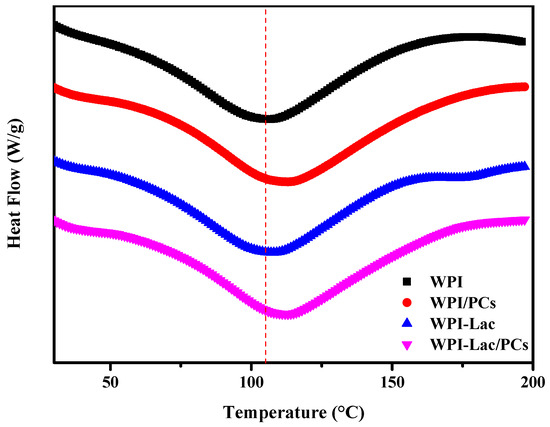 As can be seen from Table 4, the thermal denaturation temperature of WPI-Lac is higher than that of WPI; in Figure 7, the initial annealing temperature and thermal denaturation temperature of WPI-Lac/PCs are significantly higher than those of WPI. This indicates that when the protein is covalently bound to lactose, the thermal stability increases, and after compounding with PCs, its thermal stability is further improved. This may be the result of the Maillard reaction and is consistent with the results of Liu et al. [11]. The complex of PCs creates steric hindrance on the protein surface, inhibiting the stretching of protein peptide chains [11].