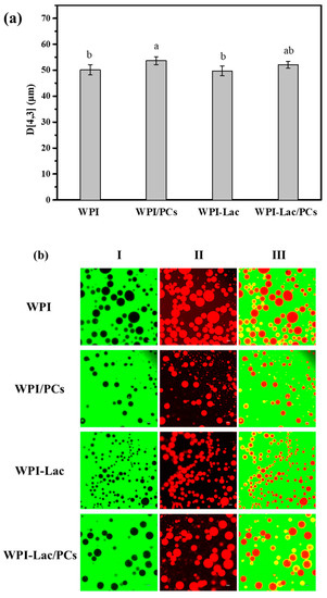 WPI, WPI/PCs, WPI-Lac, and WPI-Lac/PCs stabilize the properties of Pickering emulsion at pH 6.0: particle size (a); the CLSM pictures of Pickering emulsion (b). Different letters indicate a statistically significant difference (p < 0.05).