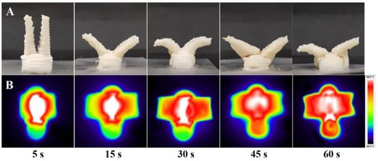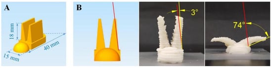 However, when the microwave heating time was 15 s or 30 s, there was no distinct difference in the deformed angles of the printed samples with base thicknesses of 4, 6, and 8 mm (p > 0.05), while the bending angle of the sample with a base thickness of 10 mm was significantly larger than that of other samples, showing a greater deformed degree. As shown in Figure 5B, when the microwave heating time reached 30 s or 45 s, the material deposited between the two wings part of the printed sample with a thickness of 10 mm showed visible fractures, which was related to the overheating temperature in the gully region. At this time, the bending angle of the wing part of the printed sample without traction from the model base was not only affected by the driving force produced by the swelling of the gully part, but also caused to collapse downward by the gravity effect of the wing part itself, showing a greater bending angle. Moreover, the bending angles of the printed structures with different base thicknesses increased or decreased at 45 s, at which time the bending angle of the printed structure was positively correlated with the base thickness. The maximum angles of the models with 4, 6, 8, and 10 mm of base thickness were 74.85°, 71.64°, 70.58°, and 106.42° within 45 s of microwave heating time. As the base thickness was raised from 4 mm to 10 mm, the deformed angle increased by 1.42 times.
