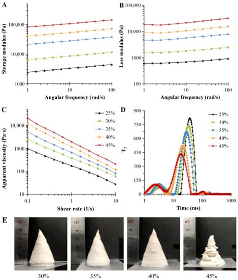 Storage modulus (A), loss modulus (B), apparent viscosity (C), LF-NMR profiles (D), and printed results (E) of yam gels with different yam powder contents.
