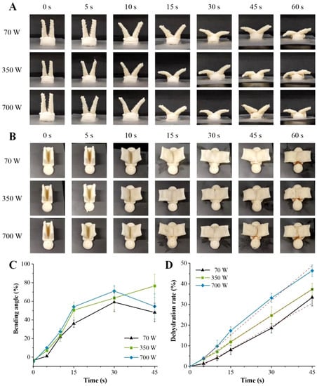 Shape change photographs in front view (A) and lateral view (B) of the printed samples, and the changes in the bending angle (C) and dehydration rate (D) at different microwave power levels.