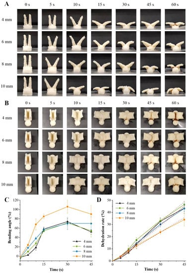 Shape change photographs in front view (A) and lateral view (B) of the printed samples, and the changes in bending angle (C) and dehydration rate (D) with different model structures.