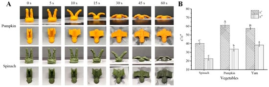In the process of microwave heating, the difference in materials directly affect the microwave heating efficiency, which can be essentially determined by the dielectric property of the food materials. The dielectric property is the response of bound charges in the molecules to the applied electromagnetic field [45]. The dielectric properties ε′ and ε″ determined the interactions between the electromagnetic field and the materials, representing the capacity of the materials to store electromagnetic energy and convert it into thermal energy, respectively [16]. The dielectric properties of the three vegetable gels are shown in Figure 6B. The ε′ values, from high to low, were arranged in the following order: pumpkin gel (61.33) > yam gel (57.67) > spinach gel (40.33). The ε″ values, from high to low, were in the order of yam gel (38.33) > pumpkin gel (33.67) > spinach gel (22.67). The differences in the dielectric properties of the materials were mainly related to the type of materials and their material characteristics (bulk density, water content, etc.) [45]. As a kind of polar molecule, water molecules moved under the action of the microwaves and produced a friction effect, which increased the internal energy of the materials and achieved the effect of rapid heating [14]. The ε″ indicates the capacity of the food material to absorb microwaves, and the greater the ε″ value, the faster the heating rate [35]. Compared with spinach gel, the yam and pumpkin gels exhibited stronger dielectric properties and higher microwave absorption properties, corresponding to higher microwave heating efficiency and 4D change efficiency. The results demonstrated that the deformed efficiency of the 4D-printed samples under microwave induction can be predicted by studying the dielectric properties of the materials.