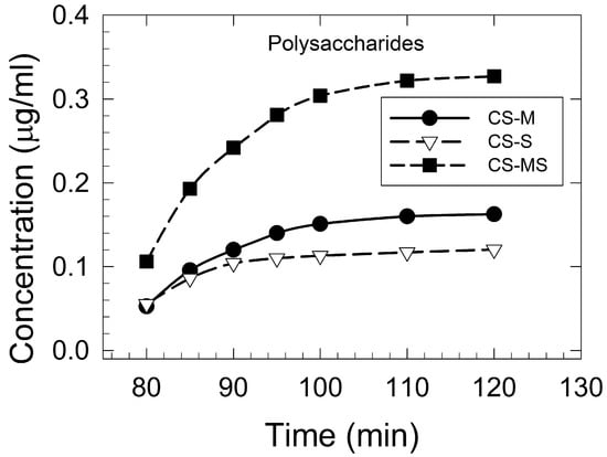 Polysaccharide extraction was found to have a positive correlation with extraction time and temperature, especially for the traditional hot water extraction [31]. All the CS maturity samples showed similar exponential extraction kinetics patterns up to a 120 min extraction time (Figure 1). Using a longer extraction time (>120 min) and a higher temperature (>100 °C) had no significant effect on the polysaccharide concentration, indicating 120 min as the optimal extraction time. The highest polysaccharide content was determined for the CS-MS sample (0.33 μg/mL), followed by CS-M (0.16 μg/mL), and CS-S (0.12 μg/mL).
