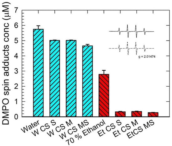 The EPR spectra monitored in CuCl2/H2O2 solutions containing DMPO spin trap reveal the four-line signal characterized by the spin-Hamiltonian parameters typical for the •DMPO-OH adduct (aN = 1.504 mT, aH = 1.484 mT; g = 2.0057; inset in Figure 2). It was found that the decrease in the •DMPO-OH concentration reflecting the radical scavenging ability of extracts was much stronger for the extracts in 70 v.% ethanol than the ones in water (Figure 2). This indicates the higher efficiency of ethanol as a solvent to extract compounds acting as the radical scavengers. A similar trend in the scavenging ability was observed for the extract series prepared in water or ethanol. It was found that the mature stage (CS-MS) extracts had the strongest radical scavenging ability in comparison to the other stages (CS-M was the weakest). The overall antioxidant activity increased with the maturity of CS, suggesting a higher production of bioactive compounds throughout the natural maturing process.