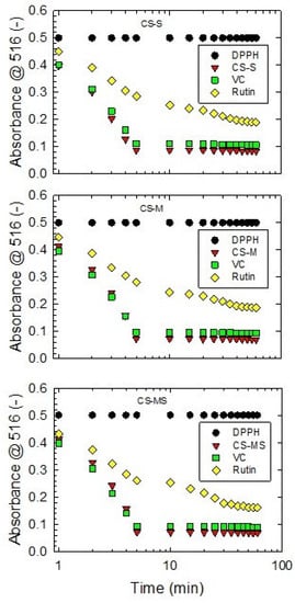 CS extracts exhibited a prominent DPPH scavenging effect in the time interval of 0 to 5 min, after which the radical scavenging activity dropped to a constant value (Figure 3). A similar trend was observed for rutin. The radical scavenging activity of CS extracts was found to be more constant than vitamin C. Using a higher CS concentration provided a stronger scavenging effect, consistent with the antioxidant behavior of rutin and vitamin C (Table S1). The values presented are in accordance with the data presented by Abirami et al. [56] for corn silk ethanol extracts. Obtained results are also comparable with data reported by Liu et al. [11] for corn silk fractions extracted in different solvents; the percentage of DPPH radical scavenging activity for CS acetic ether and butanol fractions presented by the authors are in good agreement with the values determined in our study. Moreover, the results of DPPH scavenging activity (Table S1) obtained for different CS maturity stages are compliant with EPR data, as presented in Figure 2. The strongest DPPH radical scavenging effect was observed for the CS-MS sample (65.20 ± 0.90%), followed by CS-S (59.33 ± 0.61) and CS-M (59.20 ± 0.92), respectively. However, the difference between CS-S and CS-M was not statistically significant.