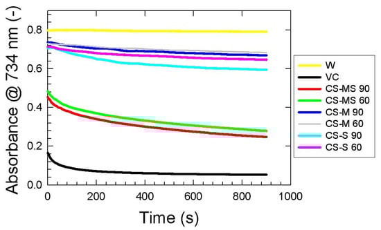 As evident from Figure 4, there is a decreasing trend in absorbance values of corn silk extracts, indicating a progressive reaction between antioxidant compounds and ABTS radicals. After 5 min of this reaction, the trend of scavenging kinetics changes mildly, and the quenching of free radicals becomes less intense. Similar behavior was observed for vitamin C; compared to this substance, CS samples seem to be more time-dependent antioxidants. As expected, inhibition of ABTS radicals is increasing with increasing corn silk extraction times (Supplementary Table S2).