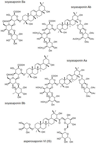 Chemical structures of soyasaponins (soyasaponin Aa, soyasaponin Ab, soyasaponin Ba, and soyasaponin Bb) quantified in this study and asperosaponin VI (used as internal standard (IS)).