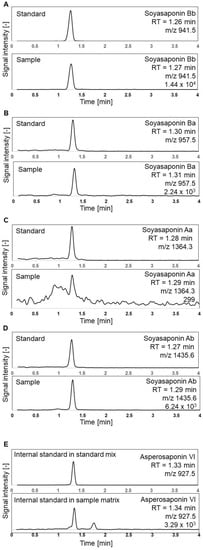 The experiment demonstrated that the soyasaponin Bb, soyasaponin Ba, soyasaponin Aa, and soyasaponin Ab MEs were 91%, 94%, 99%, and 94%, respectively. According to the guidelines, the achieved MEs were at an acceptable range [], indicating sufficient sample clean-up.