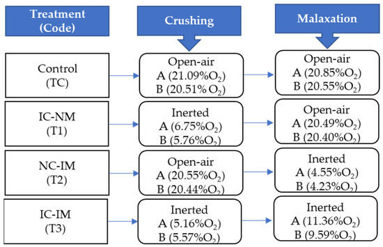 For the olive oil extraction in control conditions (21% O2) with oxygen reduction (inertization) in crushing or malaxation, or both, a system of extraction of the two phases with a hammer mill, horizontal mixer (350 l), and centrifugal extractor was used (Model Il Molinetto, Pieralisi, Italy). The modification of the atmospheric oxygen concentration in the milling and malaxation of the olive paste was performed by introducing molecular nitrogen into the mill and mixer, previously sealed with polypropylene. The percentage of oxygen was monitored with a device called Oxybaby every ten minutes (WITT Gas, Witten, Germany). For each extraction trial, batches of 200 kg of olive fruit were processed. Figure 1 shows in parentheses the average level of oxygen in atmospheric conditions and the measures for each treatment and repetition (A and B) in milling and malaxation. The open-air step is considered “normal or control”. For each extraction trial, the olive paste was mixed for 30 min at 25 °C and the oils obtained after centrifugation were decanted, filtered, and stored under frozen conditions (−20 °C) until analysis.